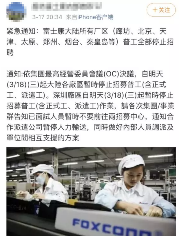 就连“世界工厂”富士康,也传出在大陆所有厂区(廊坊、北京、天津、太原、郑州、烟台、秦皇岛等)全部停止招聘普工的消息。