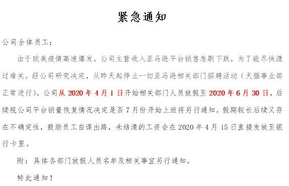 昨天,一家公司发布了一则紧急通知,表示公司亚马逊部门将放假至少3个月,内容如下: