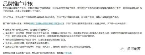 此外,当您提交品牌广告时,广告必须满足某些要求才能获得批准。第一步:转到【广告活动管理】,点击【创建广告活动】,然后选择【品牌推广】。第二步:输入品牌广告投放信息。(上面说明过的将不再赘述)①着陆页:选项包括品牌旗舰店、新商品列表页面。如果选择品牌旗舰店,那么最好是已经设计优化好的旗舰店页面并且保证想要推广的商品必须已经在店内销售。 如果选择新商品页面,则需自己添加新商品页面。②选择要推广的商品:必须至少提供 3 件商品(但不得超过 100 件),为了获得最佳效果,建议选择同一分类中的商品或具有相似关键词的商品。(1款商品用子变体可重复放到1,2,3位置,但是提交后不可修改,请慎重考虑)品牌名称和徽标:徽标选择 1MB 以下的 400x400px的图片。第四步:提交广告以供审核。在提交之前,请检查所有信息,以便确保审核通过。广告活动一旦获得批准后,将无法编辑某些详细信息,例如您的着陆页、商品或广告素材,要进行更改,需要存档广告活动并创建一个新的广告活动。品牌广告需要通过亚马逊审核,广告活动才能上线。审核结果会发送电子邮件,审核流程通常会在 24 小时内完成,但最长可能需要 3 个工作日。