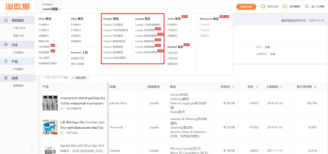 不仅有Wish、Lazada、Shopee等平台的数据,还在持续对接其他平台,更新快,品类全,值得拥有。
