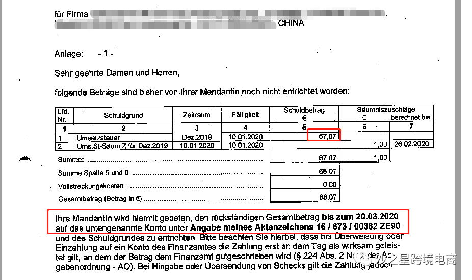 罚款信对于卖家来说,这是可以避免的,也不会影响到店铺的销售,但是罚款信一直未交的,还会收到税局的二次来信,提醒卖家尽快支付,否则会面临的封店危险。以下是卖家一直未支付罚金,(需支付19年12月税金和晚支付税金罚金共需支付 68.07欧,需在3月20日支付,否则税务局即将封账号)税局来信卖家再不支付,就把卖家的账户封掉。
