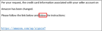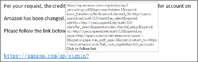 一些网络钓鱼电子邮件中包含一个链接, 貌似会带您到您的亚马逊帐户, 但其实它是一个假冒的链接并会带您抵达一个完全不同的网站。如果在电子邮件客户端中查看邮件时将鼠标悬停在链接上, 通常可以看到错误的网站地址。