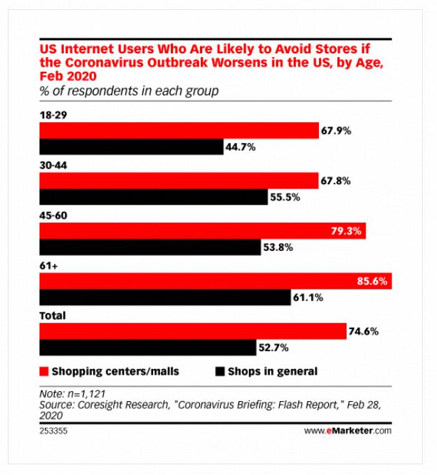 一项2020年2月的Coresight研究调查显示,27.5%的美国互联网用户也开始避开公共场所的接触,与YouGov的调查结果一致。但它也表明,如果美国的冠状病毒疫情恶化,58%的人会开始自我隔离,购物中心和商店被超过一半的受访者表示会选择避开。