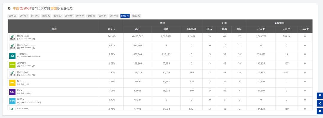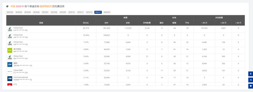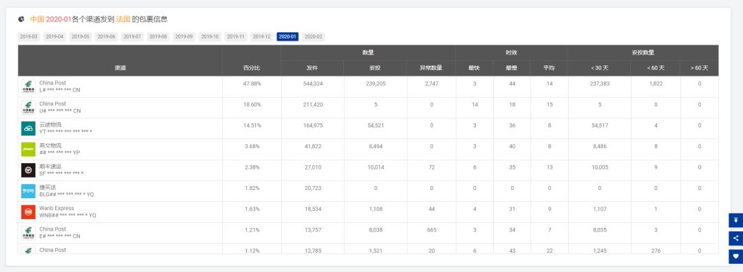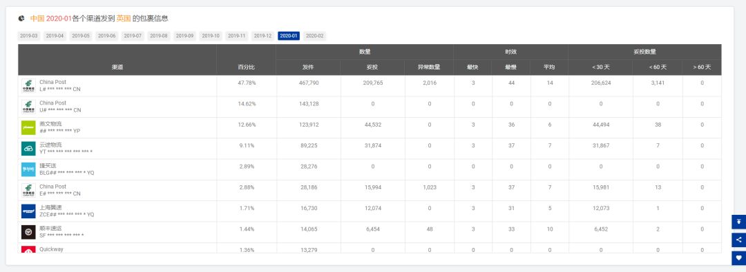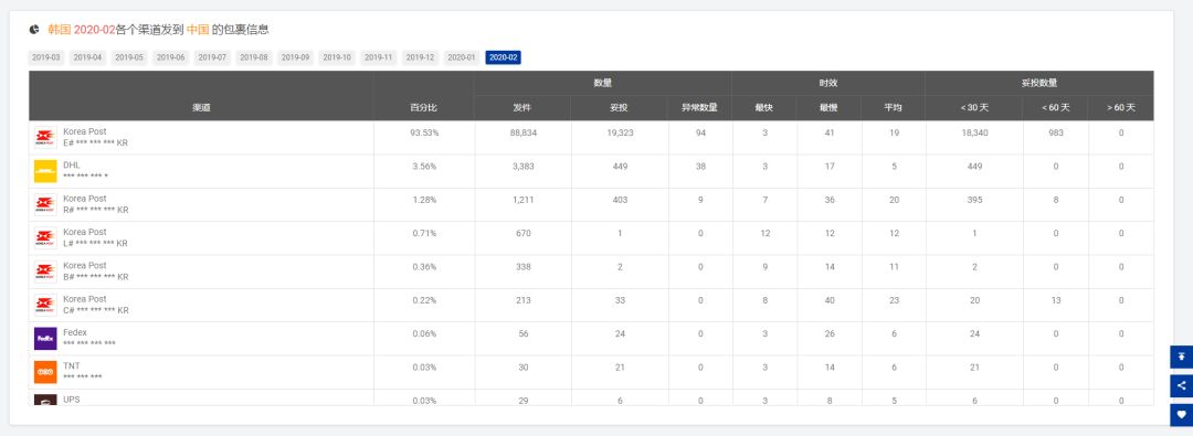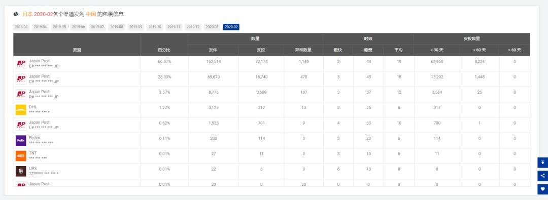 08 取样[e邮宝]妥投率为40.90% 注:参考[2020-01]发货的时效,平均是17天,最慢是44天 09 取样[e邮宝]妥投率为44.84% 注:参考[2020-01]发货的时效,平均是14天,最慢是44天 10 11 12 以下是2月份从韩国、日本进口包裹的时效参考,妥投率≠该渠道的全部妥投率 13 取样[韩国邮政EMS]妥投率为21.75% 14 取样[日本邮政EMS]妥投率为44.41%