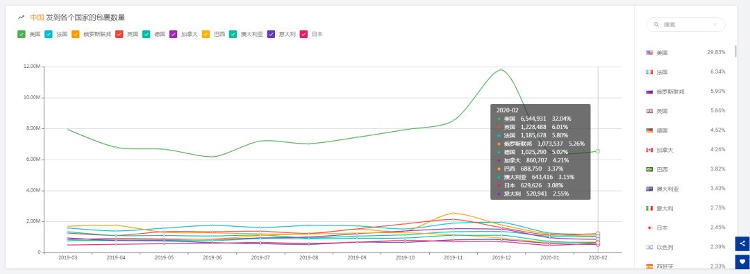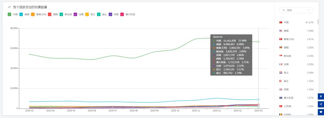 如下图所示,2019年的数量比2018年增长了27.09%,特别是在2019年的第四季度,数量增长明显,在2020年的1月份,首次单月超过6,400万票,虽然因为中国农历春节以及疫情的影响,但是在2月份,仍然超过6,300万票,还有相当一定的包裹是积压着出不去的。