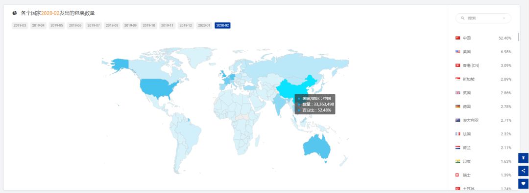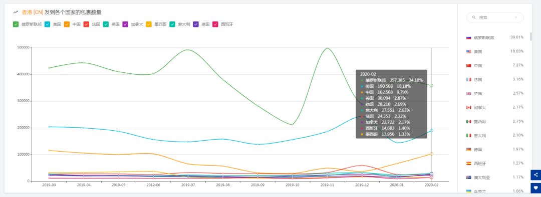 注:中国香港邮路发往俄罗斯仍然是最多的,虽然略有下降,但仍然高达34.01%,较最近12个月平均下降4.91%;另外中国香港发往中国大陆比例上升2.42%