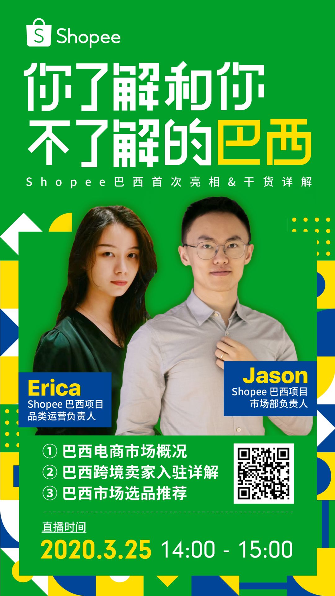 介绍了这么多,是时候再为这场跨境狂欢再添一剂猛料了!Shopee将为巴西新卖家带来一系列入驻福利:新店免佣、急速开店、多种热门推广活动免费参加!3月25日,巴西市场官方招商直播,Shopee巴西项目市场部负责人Jason与品类运营负责人Erica,将带你探寻你了解和你不了解的巴西。收藏直播二维码,25日准时扫码观看直播,跟着Shopee玩赚巴西!