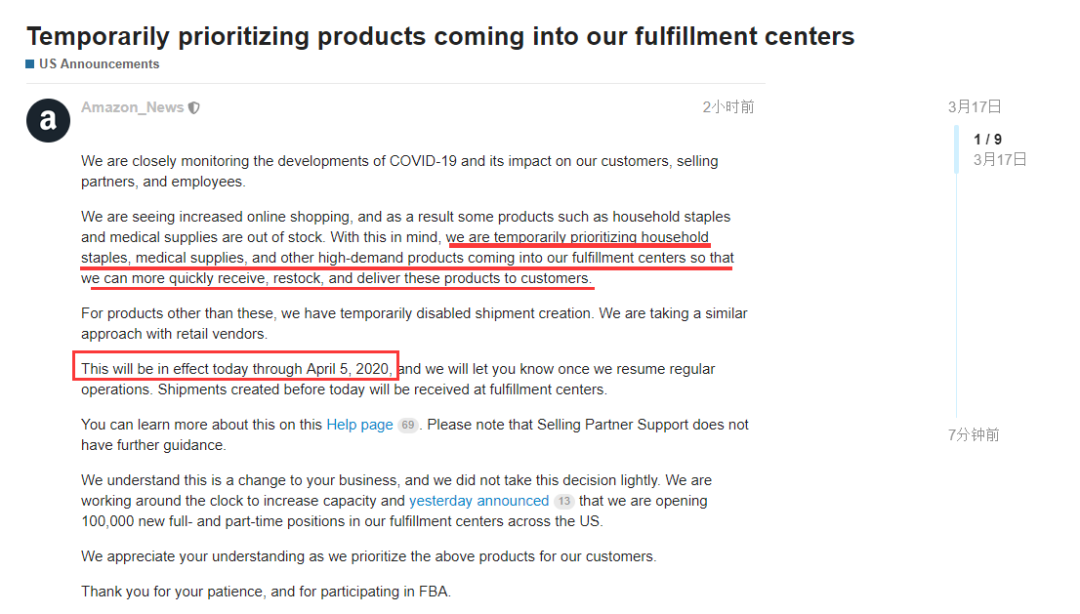 昨天,亚马逊发布了关于“ FBA 非必要商品停止入库” 的公告。公告内容为,亚马逊将优先接收生活必需品和医疗用品,其他产品都不能发往亚马逊仓。