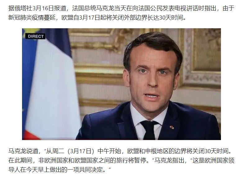 法国总统马克龙在向法国公民发表电视讲话时指出,由于新冠肺炎疫情蔓延,欧盟自3月17日起将关闭外部边界长达30天时间。