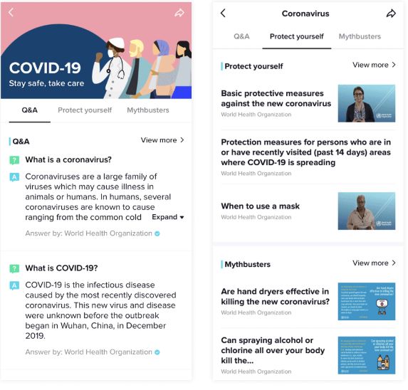 TikTok还在视频页面添加了与冠状病毒有关的链接,以提供用户查阅有关COVID-19的可信来源信息