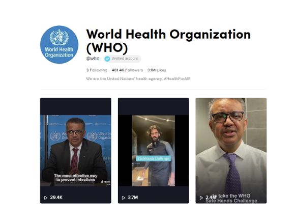 世界卫生组织(WHO / World Health Organization)还利用其认证的TikTok账户分享视频,这些视频提供了围绕COVID-19危机事件的最近进展,使其能够与该应用的年轻受众群建立联系。