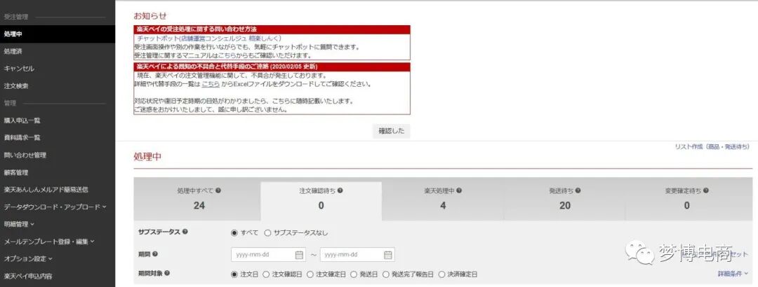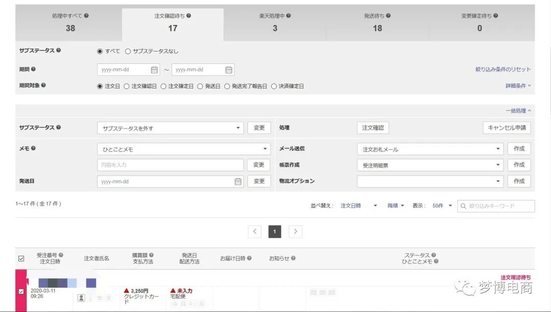 【楽天処理中】中的订单是不需要进行操作的,乐天商店的下单流程是:买家下单——卖家确认订单——买家付款——卖家确认后发货——到货后买家确认订单——乐天确认后订单结束(相比亚马逊,日本本土的乐天商店在操作上确实显得非常繁琐复杂,很有日本的风格和特点),卖家确认后等待买家付款的订单就会出现在【楽天処理中】这个界面中,买家付款结束后,【楽天処理中】中的订单会自动转移到【発送待ち】界面中。