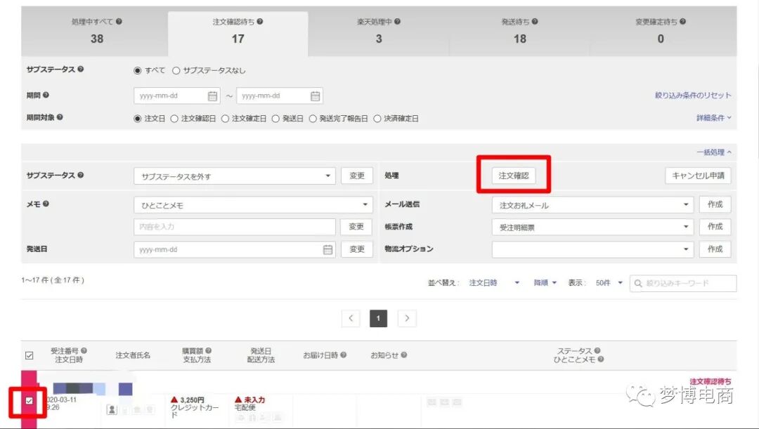 进入该界面后,首先点击订单左侧的小方格选中订单,然后点击【一括処理】按钮,会弹出订单处理界面,这时点击【注文確認】按钮,【注文確認待ち】界面中的订单就会转移到【楽天処理中】界面内。