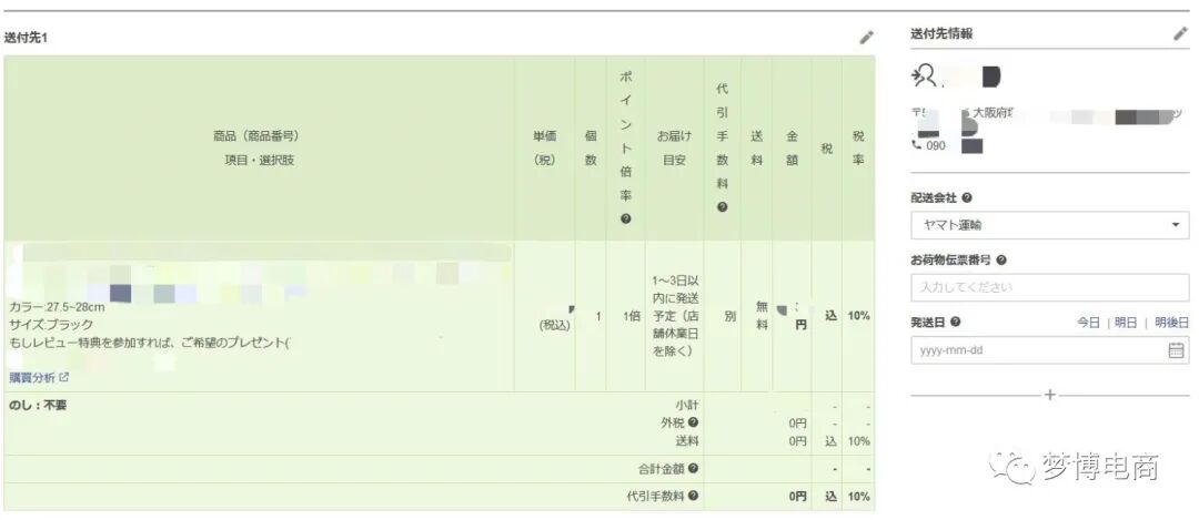 买家的送货地址和买家信息都在【送付先情報】中,这里要注意不要跟上面的【注文者情報】搞混了,有时订单会出现这两个地址不同的情况,此时以【送付先情報】中填写的地址为准。 【送付先情報】下方的【配送会社】中填写送货公司信息,该信息买家也可以查看到,方便买家查看自己包裹的物流信息。【配送日時指定】中的时间也要注意,填写时间的买家很有可能其他时间不在家中,为了避免货物运送中发生买家不在的情况(在日本有时会发生买家不在导致货物运送失败的情况),发送货物时不要漏掉指定时间信息。