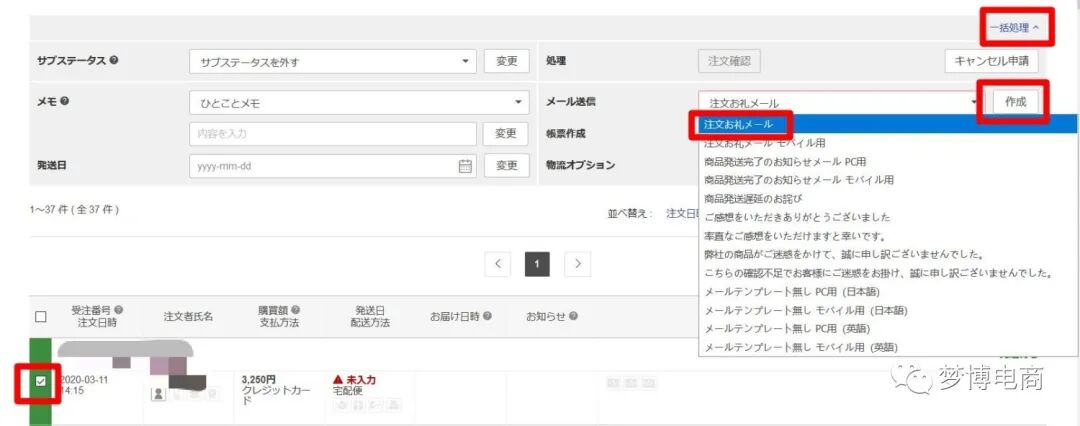 【発送待ち】中的订单是卖家需要发货的订单,乐天商店的订单需要买家发送两封邮件给卖家,第一封是在卖家发货之后需要发送邮件提醒买家已经发货,第二封是在货物送到卖家手里后发送邮件提醒卖家确认订单完成,可以说跟国内的各大电商平台走的流程相似。那么如何向买家发送邮件呢?操作步骤和订单确认相似,同样,卖家首先选择需要发送邮件的订单,然后点击【一括処理】按钮,在【メール送信】栏选择第一封【注文お礼メール】,再点击【作成】按钮就会进入邮件发送的界面中了。