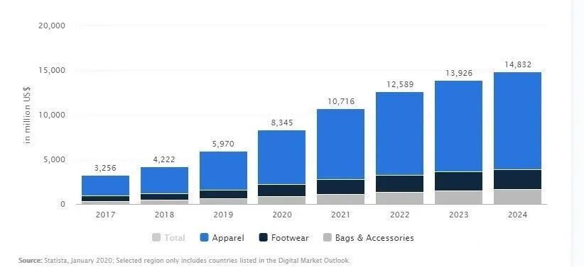 根据JUMIA Q4季度的财务报告显示,与2018年第四季度相比,JUMIA在2019年第四季度大多数品类的GMV增长在20%至50%范围内,就售出商品而言,JUMIA平台的大多数品类均增长超过40%,手机和电子产品也有所增长。并且在2019年全年的年度活跃消费者达到创纪录的610万,与2018年相比,同比增长了54%。今天,小编也根据2019年的JUMIA各个品类销售数据,为各位卖家朋友们整理了一份选品攻略。根据Statista的数据显示,目前时尚产品仍是非洲电商市场的热销品,预计2020年的市场容量为83.45亿美元。而服装占整个时尚细分市场的比例高达73%,市场规模达61.34亿美元。