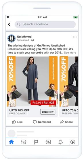 该服装品牌为其年终促销进行了一项转化活动,在Facebook上使用动态广告来吸引巴基斯坦和其他南亚市场的人们。利用轮播格式的动态广告,Gul Ahmed展示了一系列人们更感兴趣的商品,然后利用精品栏广告在每个广告中显示一段视频和一些精选产品。当视频突出显示产品折扣时,所有广告都直接链接到该品牌的在线商城,人们可以在Gul Ahmed的商城购买他们看到的商品。这样一来,人们不必离开Facebook就可以从发现商品无缝衔接到购买商品。这个campaign广泛地定位到对时尚感兴趣的巴基斯坦男女。同时,Gul Ahmed对访问过其网站的用户进行了再营销,并根据这些受众群体创建了类似受众,来寻找更多可能对其产品感兴趣的人。为了吸引更多巴基斯坦以外的人,这家时装零售商还使用了多国类似受众。