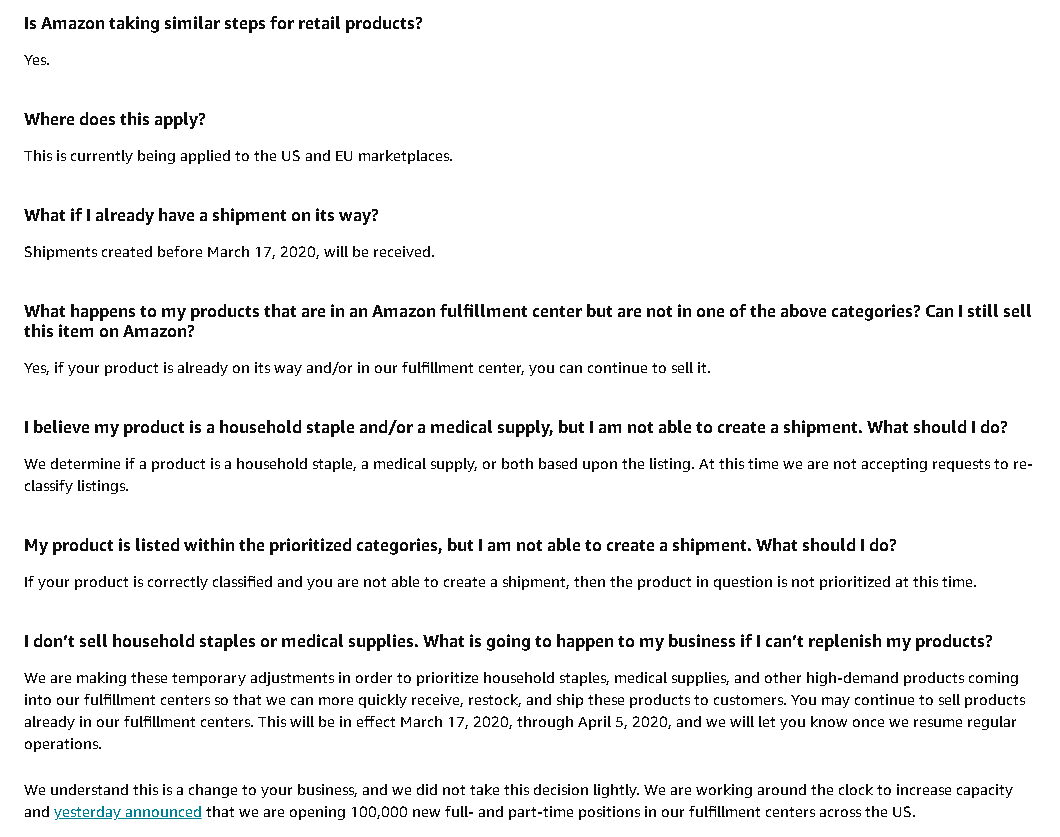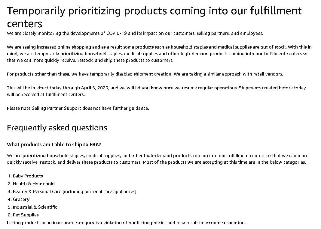 截至4月5日前,亚马逊优先考虑家庭必需品,医疗用品和其他高需求产品进入物流中心。如有违反上市政策,可能导致封号处理。