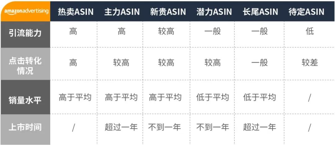 根据引流能力、点击转化情况和销量水平,你可将满足基本资格的ASIN按以下表格进行分类。