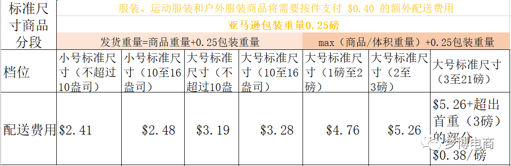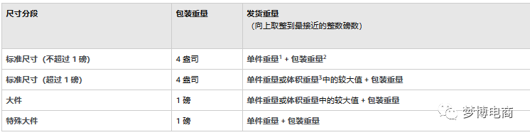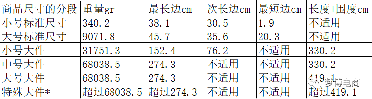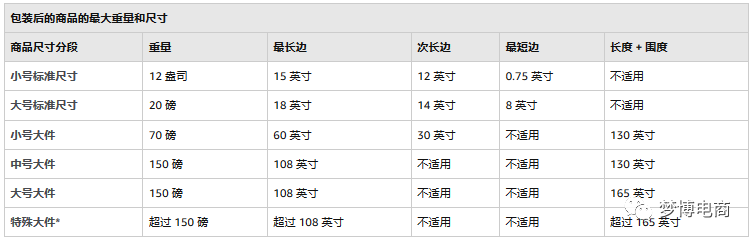 正文内容分成三个内容:了解计算费用的大概步骤+2020年物流配送费的变更+亚马逊收益计算器标准尺寸商品是指完全包装后的重量不超过 20 磅并且尺寸不超过以下标准的商品:超过上述尺寸的商品属于大件商品。如果商品成套销售,那么我们会计算整套商品包装在一起之后的总体重量和尺寸。要确定商品的正确分段,请在下表中找到测量值不超出商品的重量或尺寸的行。注:1磅=16盎司=453.59克 1英寸=63.5px 围度=(最短边+次长边)x2
