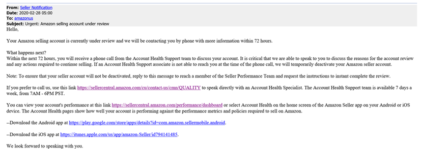 315消费者权益日来啦,又到了人人“打假诉苦”的时候,小编最近也收到了一些卖家的反馈,他们表示收到了来自于seller-notifications@amazonservices.com的邮件和疑似AHS(Account Health Support)的电话通知。在收到反馈后,小编立即联系AHS团队,经确认,@amazonservices.com不是一个真实的亚马逊后缀,此邮件为钓鱼邮件。