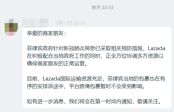 根据Lazada站内信以及小二在钉钉群发送的消息来看,菲律宾“封城”消息发布以来,暂未对跨境卖家产生影响。但是即使如此,还要注意两个问题: