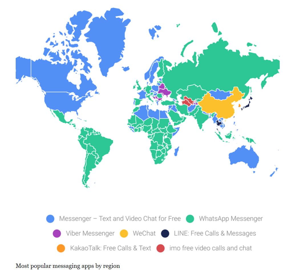 如上图所示,虽然Messenger在西方市场更为普遍,但WhatsApp现在整体规模明显扩大,并继续在发展中市场获得吸引力。