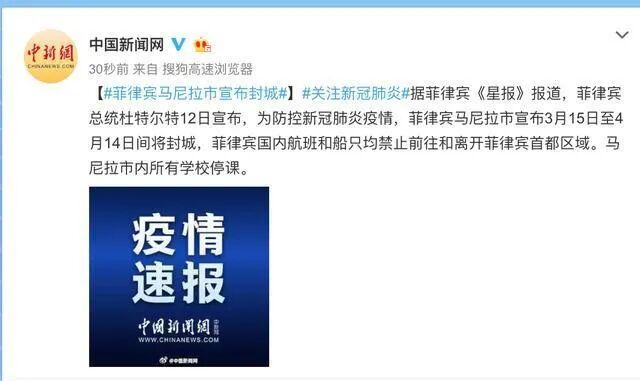 据菲律宾《星报》报道,菲律宾总统杜特尔特12日宣布,为防控新冠肺炎疫情,菲律宾马尼拉市宣布3月15日至4月14日间将封城,菲律宾国内航班和船只均禁止前往和离开菲律宾首都区域。马尼拉市内所有学校停课。
