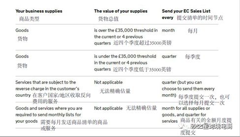 如果客户是在英国注册了VAT的企业或卖家,并向其他的欧盟国家/地区的已注册VAT客户进行了商品交易或商业服务,那么该企业或卖家就有义务将这些商品交易和商业服务告知英国税局。英国税局会向客户发送一份欧盟销售清单(EC Sales List)来了解以下信息:1.企业或卖家在欧盟国/地区产生商品交易或商业服务的客户的详细信息;2.企业或卖家进行商业活动的花费金额;3.客户的国家代码。