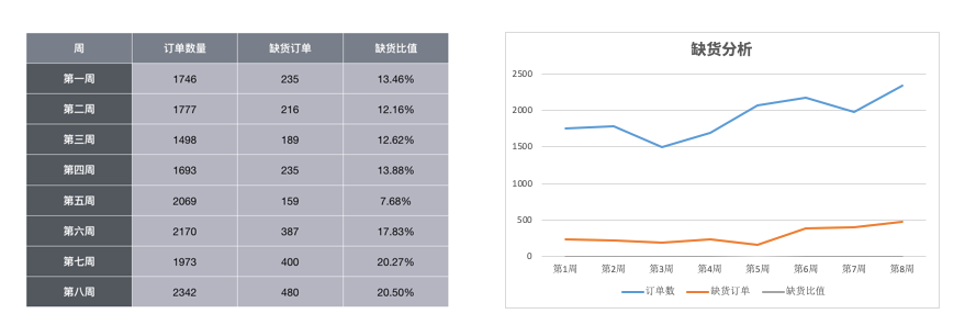 我们以50%作为缺货比值警戒线,缺货比值超过50%的员工需要采取跟踪供应链状况、排查缺货产品是否仍在出单等措施。