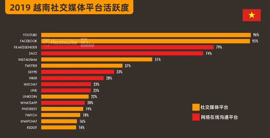 值得注意的是,越南本土企业 VNG 旗下的 Zing Me 也在越南有着坚实的用户基础,高达29.8% ( Twitter 仅19.2%),来自我国的 Weibo 也闯入前十,占比 4.7%。