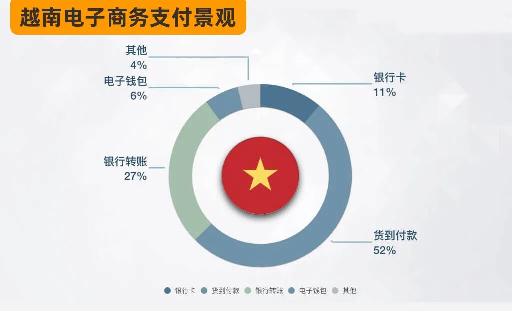 即使在电商蓬勃发展的今天,越南的支付方式仍然跟不上步伐,货到付款(COD)和直接现金支付仍然占据主流地位 ,移动支付及电子钱包等数字支付方案尚未完全发展。在这样一个“现金为王”的越南社会,货到付款与现金支付占据了 52% 的市场份额,其次为银行转账 27% 、银行卡 11% 、电子钱包 6% 以及其它 4%。