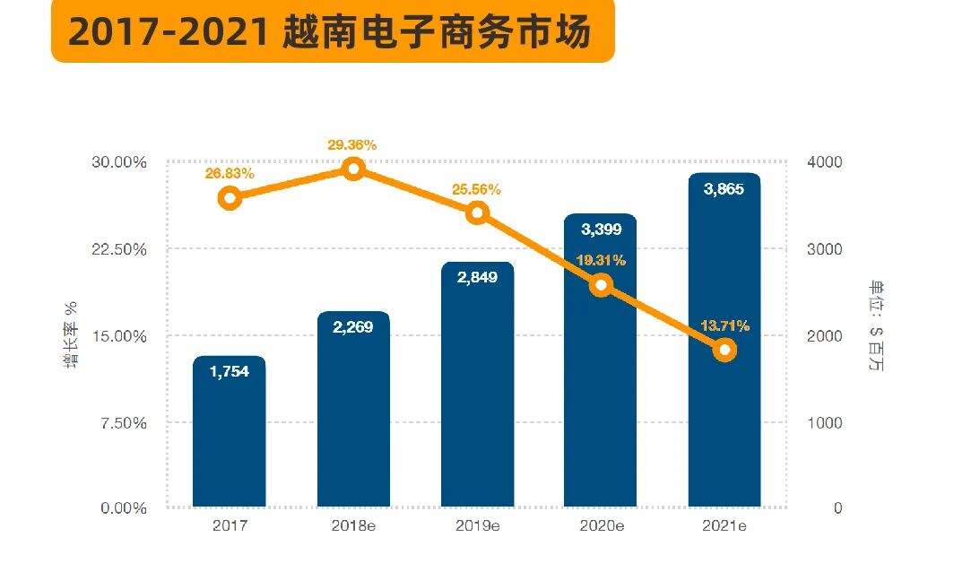 2017 年越南电商销售额仅占总零售额的 0.7%,但随着越南电商市场的高度发展,这一数值有望于2020年达到 5%。用潜力巨大来形容越南电商市场是毋庸置疑的,这个中产阶级迅速发展的国家将在 2021 年电商市场规模增至 38.65 亿美元,并在 2017-2021 年间达到 21.84% 的复合增长率。谷歌和淡马锡研究报告显示,越南已成为东南亚第二大电子商务市场,且规模将在 2025 年增长 43%。
