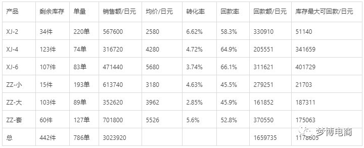 总回款日元1659735日元,回款率54.88%,折合人民币105393元132447-105393-5500=21554元;剩余21554元未收回(5500为退税利润)剩余库存完全销售可回款1178605日元, 折合人民币74841元若亚马逊仓储费和产品损耗退换货等费用占销售额8%,我们再推算下:计算仓储费和产品损耗退换货等费用的情况下计算(汇率计算0.0635):