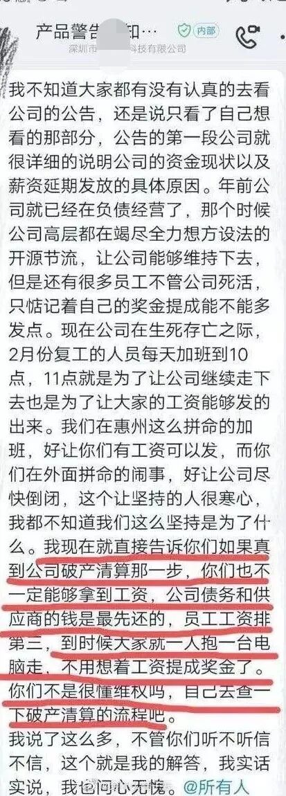 然而,在3月8日,该公司高层在内部工作群里表示,“公司年前已负债经营”,并称公告里已经详细说明公司在疫情下所背负的成本压力和现金流状况。最后更直言,如果真的到了公司破产清算那一步,员工也不一定能拿到工资,到时候大家就只能一人抱一台电脑走。