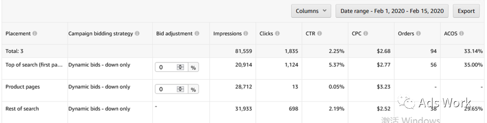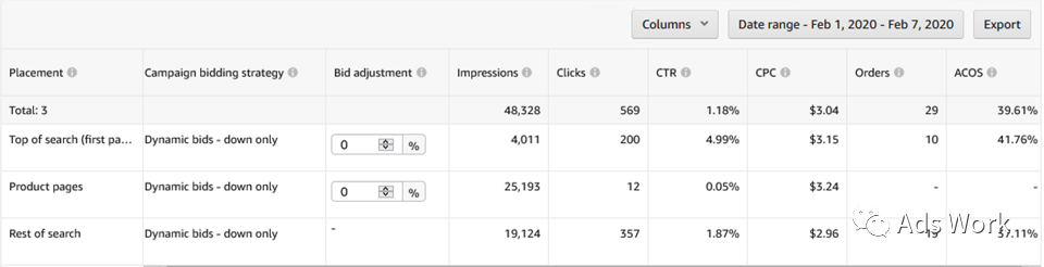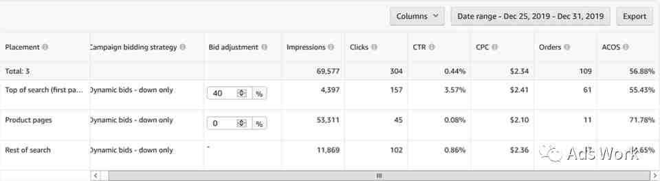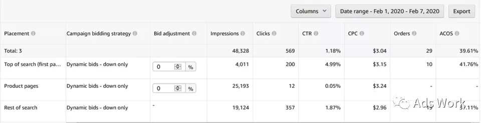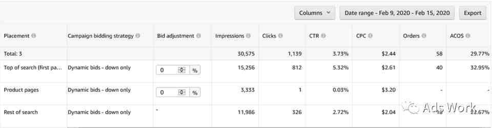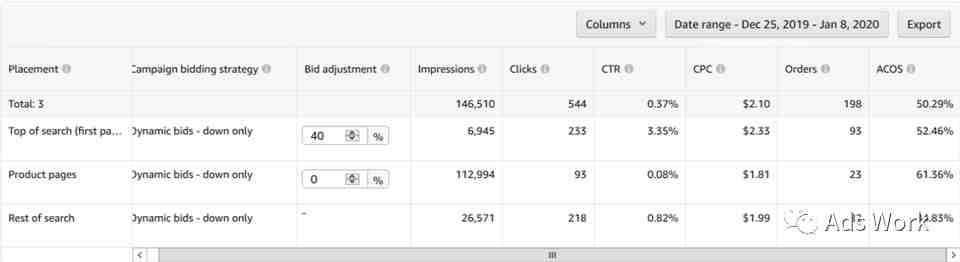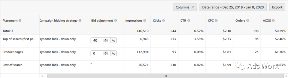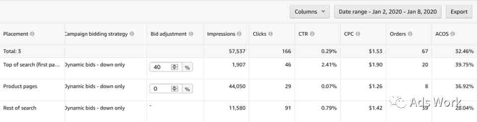 针对于转化表现较稳定的广告,使用动态降价策略。可能会出现广告流量向转化率表现较好的广告展示位倾斜的现象,CPC成本进一步下降,转化率表现平稳,ACoS得到优化。