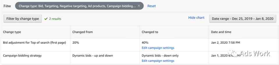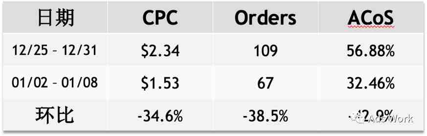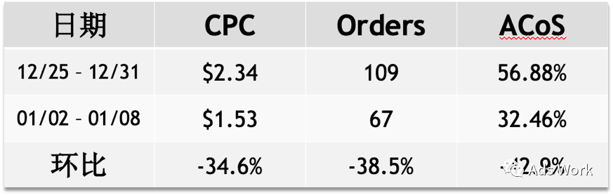 案例为10月17日创建的广告campaign,1月1日进行了广告竞价策略的调整,以此为基础选取了 12月25日 - 12月31日 与 1月2日 - 1月8日进行对比。