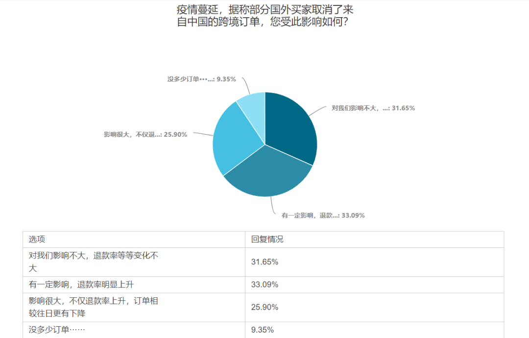 根据调研结果,80%以上的跨境电商企业都已经半复工甚至是全面复工,北上广深恢复了车水马龙。忧的是供应链一度中断带来的深远影响需要时间修复,再加上跨境电商进入淡季,65%以上的卖家表示现有订单量不如年前,甚至不如2019年同期。以下是调研结果的详细分析,包含卖家复工情况、与2019年同期业务量对比、跨境业务主要受限因素、受疫情影响的退款率等要点