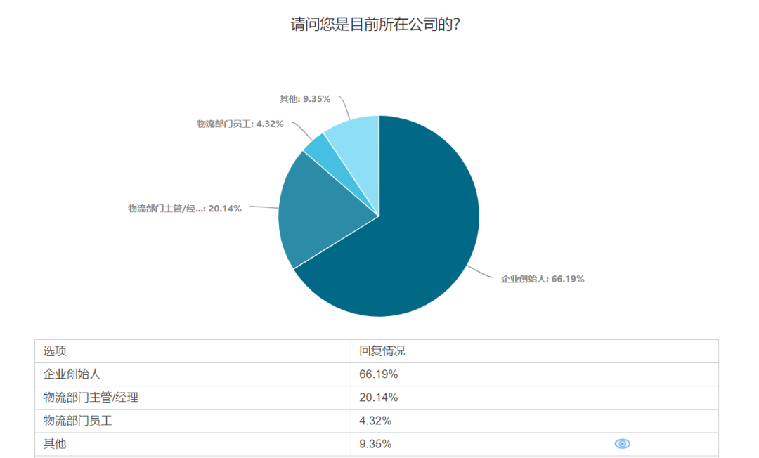 本次客户关怀获得了江、浙、沪、广东和福建地区卖家们的大力支持,这些地区是中国跨境电商的活跃地区,卖家朋友们也非常热心(点个赞)。其中,67%的调研参与人为企业创始人,可见跨境物流作为商品流通的必经环节,得到了很多创始人的高度关注或亲自把控,特别是发展前期的卖家。