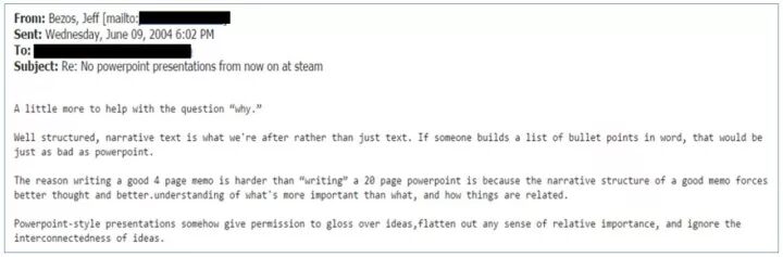 最后的话 昨天发现非亚马逊运营里面相关的文章关注很少,但我们自身是非常有必要的,所以我自己会总想关于这些方面的。 这些文章主要是我们自身需要而去总结 对其他人如果有帮助我们会觉得更值得 最近我看了这些文章和自己也在写很受触发,但基本没得到一些落地的方案。原来尝试过几个都不了了之,比如一些会议制度,内部分享制度,诸如此类的大部分公司做法,但发现这些对于人的提升和总结度不够。并且不知道如何去化繁为简,就像我们前几天在一篇文章刘润公众号提到的微软的一套提炼出多快好省在工作中的实际应用方法。最近一个月我其实想到很多,甚至一度决定让大家来分一部分精力做培训课程开发,以此来总结运营中的方方面面,但最终又想了下并不成熟。最后我经过这段时间的坚持写文章以及去年的偶尔写一些东西,发现这个写作需要我们高度,首先你所选问题范围的界定至关重要,优秀的文章必须要经过精心构思和打磨,自己本身首先要对问题有深刻的认识、有完善的数据支持还要深刻理解运作机制,并且能够把这三个方面进行有机整合;其次要对以上信息进行提炼整理、深度整合为一篇内容全面、结构清晰、篇幅精炼的文章,并且读者要能够看到文章在他们并不熟悉的领域有清晰、准确的认识。 自己想想最近写的10篇就挺难的,几乎每天都是吃完晚饭来加班赶这个文章到11点后,然后11点后回到家收拾好还要继续看书吸收更全面的知识,不然第二天完全没法写,并且在写作的过程中会经常去查看很多的细节很佐证,写完思考整篇文章的架构需要如何才能合理,还要想是否能让其他人理解,诸如此类,大家可能听我这样说没啥体会,但你们想想毕业论文,想想高三的时候我们每周一小考,每月一大考。可以说这些必要性的考试考核在我们人生中是一个个小目标,促使我们在极大的学习强度下得到了快速的成长。 在冒出这个想法以后我想找已经在运用的来佐证,其实这个想法最开始的一个冒出也在于自己偶然听到字节跳动公司在疫情期间推广飞书远程办公协作软件的一场直播中看到他们有一场飞阅会,就是这样类似形式。 另外我还找到一家更能佐证我想法的,那就是Amazon。 这件事情的最早起源来自于2004年 Amazon CEO Jeff Bezos 的一封邮件,在邮件中他解释了自己为什么希望用四页备忘录(4-page Memos)来代替 PPT(PowerPoint Presentations),邮件截图如下: 邮件截图如下: 简单翻译如下: 来自:Jeff Bezos 时间:2004年6月9日 标题:Re:从此之后,在 steam 不允许再使用 PPT 我想来简单解释一下 Why 我们要的不仅仅是一段文字,而是一段结构清晰,叙述清楚的文字。如果有人只是在 Word 中用项目符号罗列了一些短句,这和 PPT 一样糟糕。 为什么写4页的备忘录比「写」20页的 PPT 要更难?因为结构化的,叙述清晰的备忘录强迫你更深的思考,更好的理解什么事情更重要以及事物之间是如何关联的。 PPT 风格的演示文档让你轻易的掩盖相关 idea 的优先级和相关性。 注意三点,第一,这封2004年的邮件提到的是4页备忘录,而非后来流传更广的6页备忘录;第二,Bezos 在信中强调写4页的备忘录比写20页的 PPT 更难,这个的确如此,我们在日常生活中所见到的 PPT 大部分逻辑不清晰,无论是整体结构还是每一页 PPT;第三,Bezos 所强调的不单纯是写一段文字,而是结构清晰,叙述良好的文字,这是很高的要求。 现在从4页变为了6页如何写呢? 《Amazon 的秘密管理武器 - 「6页备忘录」》,辉哥奇谭;在这篇文章找到了来源,摘取如下: What we do?(背景) Why we do it? or What’s the problem(为什么做?解决什么问题?) How we do it?(我们怎样做) Validation(如何验证) Discussion/Analysis(讨论、分析) Summary(总结) 再结合具体的方法论应该如何做呢,是需要我所深思的。总之,我会立即马上进行推进,初步定位一周一篇,要求4页2000字的长度,每周会花4-5次将这些作为我们的会议内容。 在开会时参会人员会先静静的阅读备忘录文章,通过阅读让各参会人员了解讨论内容,保证会议开始时大家至少拥有相同的背景信息,交流起来能够在一个频道上。因此这个参照亚马逊的开会模式暂定是: (1)阅读备忘录,了解议题及背景,一般约半小时; (2)参会人员提出问题,质疑、讨论,最后达成一致意见。 依靠短小精悍的备忘录和快速统一认知的开会方式,让我们公司在遇到问题时内部能够快速达成共识、快速明确下一步工作,积少成多,长此以往,整个公司的效率和工作氛围都会快于之前。 接下去我会进行深入思考这个方案的落地完善方案。
