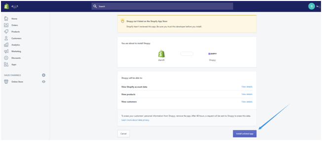 (2)授权后跳转到shopify页面,点击按钮“install unlisted app”,操作完成