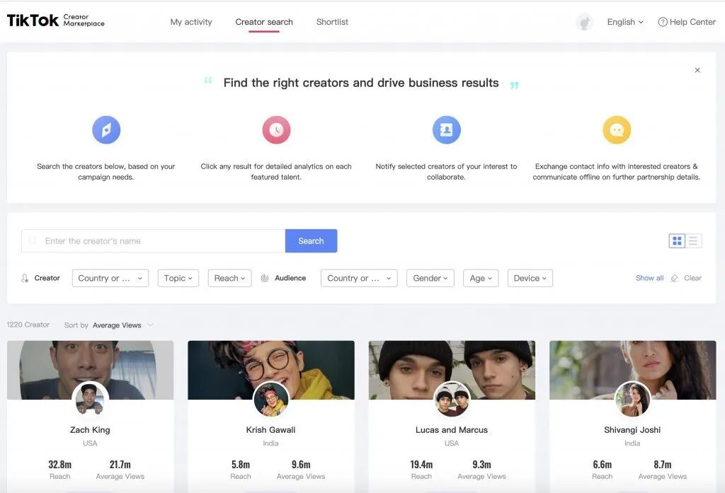 鉴于KOL在Tiktok的重要战略地位,Tiktok有一个专门为品牌方使用的Tiktok红人营销操作后台Creator Marketplace,让品牌方可以根据不同话题、地点等进行KOL营销操作。