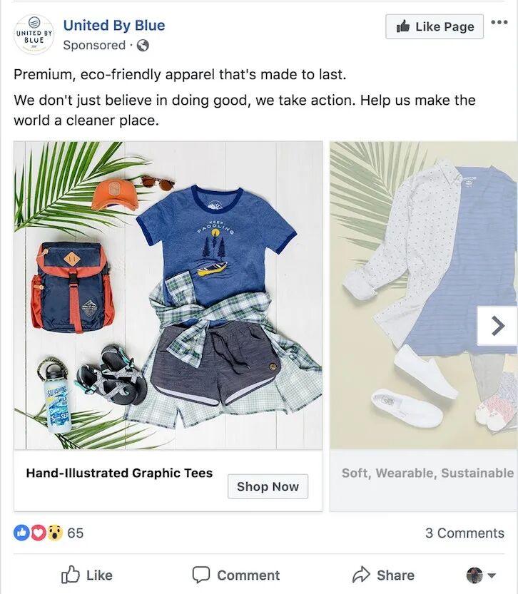 United By Blue 通过 Facebook 推广他们的环保产品。他们可以通过定位那些对环境及环境保护感兴趣的用户来推广他们的品牌。下面是他们的一则轮播广告,其中包含不同的产品系列。