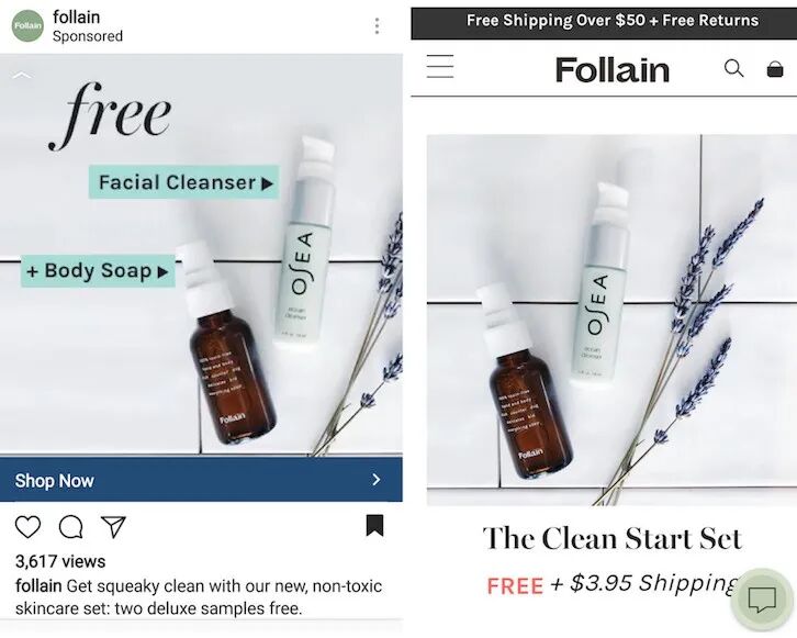 通过 Instagram 广告,你可以通过在用户的订阅更新中显示视觉广告来带动流量。美容护肤品牌 Follain 利用Instagram广告推广他们家的免费样品。你可以在下图中看到该广告的浏览量超过3600次。