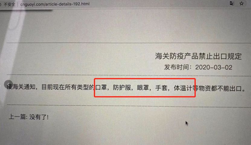 近日,朋友圈盛传这张图片上的消息:接海关通知,目前所有类型的口罩、防护服、眼罩、手套、体温计等防疫物都不能出口。