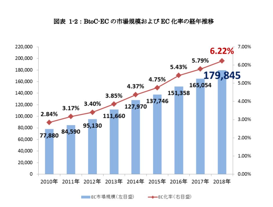纵观2019全球B2C市场,前五名占了全球市场份额的80%,日本全球排排名第四,还有很大的发展成长空间,2018年日本电商市场规模比2017年增长8.96%,总金额达到17万9845亿日元,电商渗透率达到6.22%。