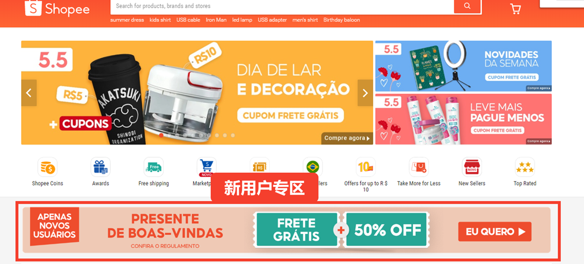巴西站点新用户将享有1张0门槛免运券 (10天限期),买家可以在新用户专区领取。