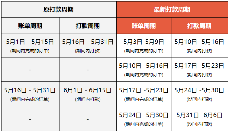 *新规则首次执行时间段:账单周期为5月3日-5月9日,打款周期为5月10日-5月16日。举例说明: