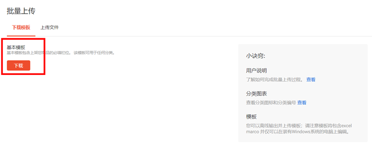 路径:卖家中心>>我的商品>>批量上传>>下载模板