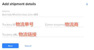 点击Add shipment details添加订单的物流信息,并填写以下信息:Tracking ID物流单号,Carrier物流商,Tracking URL物流跟踪链接。